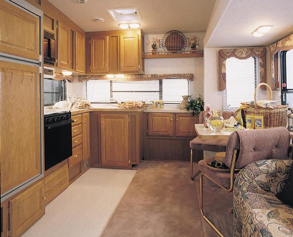 ![]() The "S" Series kitchens are remarkable for their huge windows, numerous cabinets, long counters and efficient designs. The table and chairs nestle comfortably in the glideout expansion. |