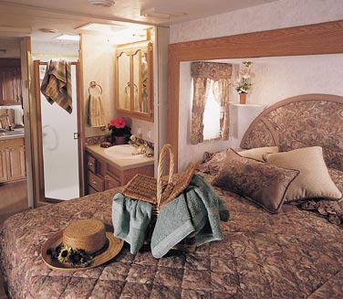 35 1/2 LKTG Rear Sonnet Decor The queen-size bed, roomy dressing area and modern bath with private toilet and angle shower are featured in all Premier Wide Body floorplans. |