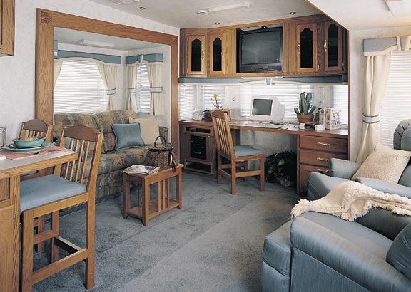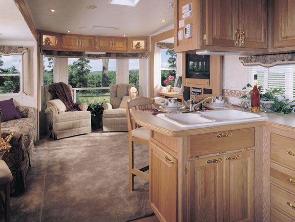 "User friendly" can be applied to the new L-kitchen arrangement with generous counter space, and a functional bar. Add the workstation/desk, rear lounge and super entertainment center, and you have a perfectly livable floorplan. |