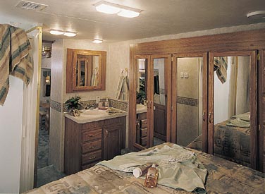 31 RKBWBG Glacier Blue Decor An efficient closet is located in the troublefree glide in this well-lit spacious bedroom/bath arrangement. |
