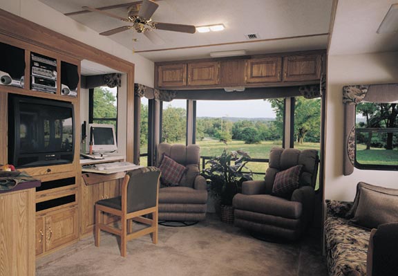 The comfortable workstation and lounge area with ceiling fan offers natural sunlight during the day and is attractively lit at night. This plan offers the best of both worlds, whether you're "surfing the net" or watching TV. |