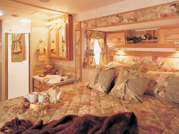This 37 Bedroom Suite, in Ivy Glenn designer decor, shows a vanity that is residential in size, while all features are usable with the electric glide rooms in the closed position. For the "full timer" who wants more storage and elbow room, this model may deserve inspection. |