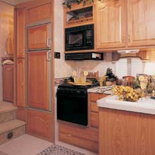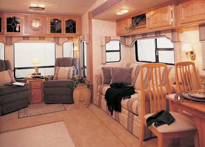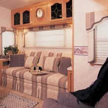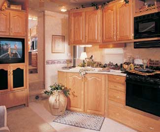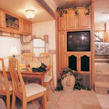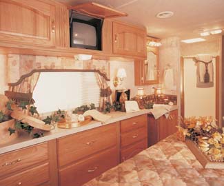![]() 34.5 SKTG LS, in Barely Taupe decor, with a desk/computer workstation comes with telephone/modem hookup, pull out keyboard, and file drawers. Angled entertainment center for optimum viewing. Color TV & CD Stereo part of the optional Value package. Optional swivel/glider recliners. |