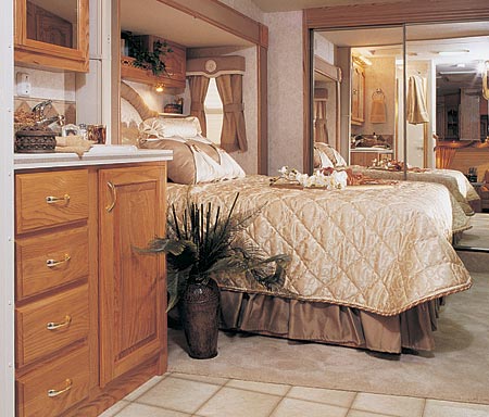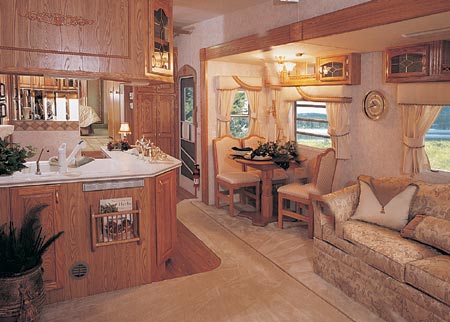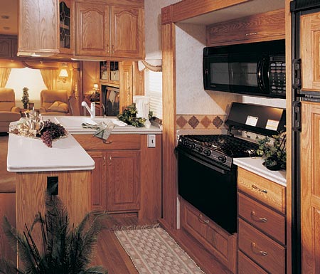 ![]() 35 CKQG - Alabaster Designer Decor This unique floor plan was designed for the chef of the house with extensive countertop space and "Design by Detail" cabinetry storage. A beautiful entertainment center with 32" TV and surround sound, leather recliners that can be reversed with sofa, and computer desk combine to provide the residential feel desired by "full timer" customers today. |