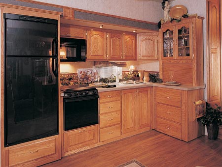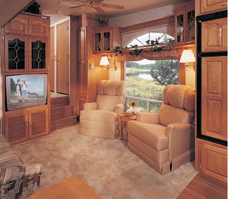 ![]() 35 RLTG - Windsor Blue Designer Decor Two comfy recliners facing the TV, or these can be reversed with the HAB sofa in front of the Vista View window. Large computer workstation below surround sound entertainment center. The double door refrigerator, microwave oven and stove move outward with the glide to create a very spacious feeling. |